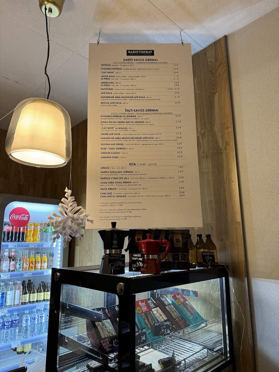 Welcome to BARISTOKRAT, a delightful cafe nestled in Vilnius at Geležinkelio g. 16. This charming spot is a haven for coffee lovers, offering an impressive menu centered around expertly crafted beverages. From the rich notes of their Espresso at just €1.20 to the indulgent Latte and Cappuccino options priced at €2.20, every sip promises quality.